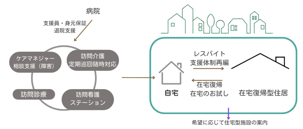 退院支援だけでなく、住宅確保、身元保証、転居支援など、生活全体を支える支援を行います。
